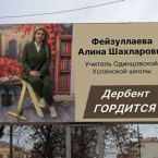 Баннеры с изображением учительницы Алины Фейзуллаевой разместили на улицах Дербента. Она защитила школьников во время трагедии, произошедшей в подмосковном Одинцово .